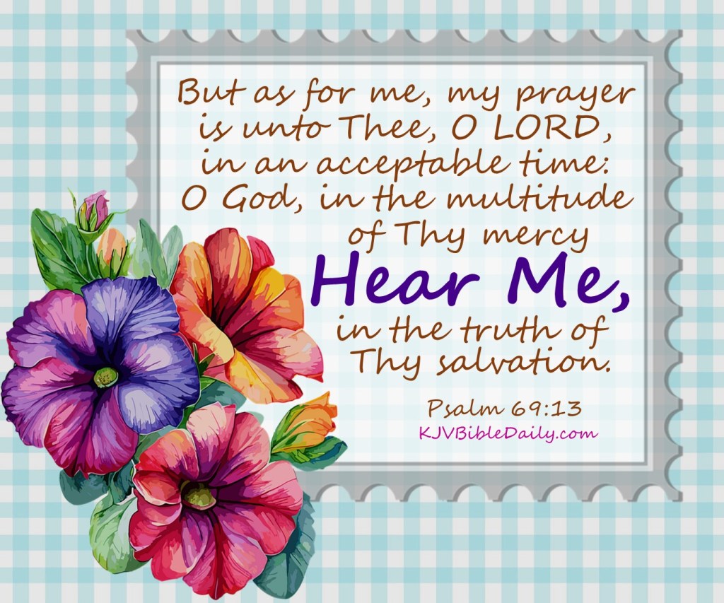 Psalm 69:13 KJV Share this:Tweet Share on WhatsApp (Opens in new window) WhatsApp Print (Opens in new window) Print Share on Reddit (Opens in new window) Reddit Email a link to a friend (Opens in new window) Email Share on TumblrPocket Share on Telegram (Opens in new window) Telegram Like Loading...