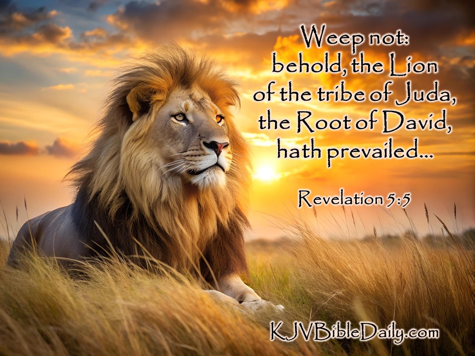 Revelation 5:5 KJV Share this:Tweet Share on WhatsApp (Opens in new window) WhatsApp Print (Opens in new window) Print Share on Reddit (Opens in new window) Reddit Email a link to a friend (Opens in new window) Email Share on TumblrPocket Share on Telegram (Opens in new window) Telegram Like Loading...