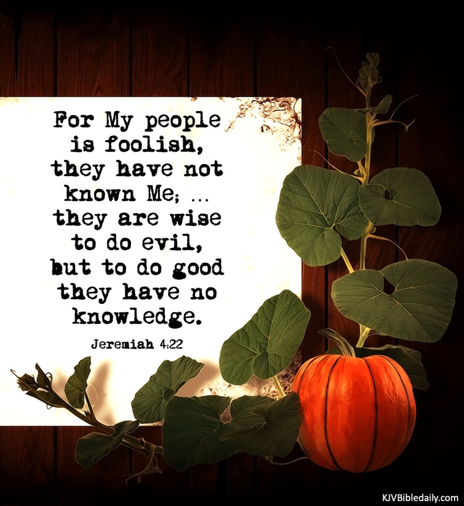 Jeremiah 4:22 KJV Share this:Tweet Share on WhatsApp (Opens in new window) WhatsApp Print (Opens in new window) Print Share on Reddit (Opens in new window) Reddit Email a link to a friend (Opens in new window) Email Share on Tumblr Share on Telegram (Opens in new window) Telegram Like Loading... Related
