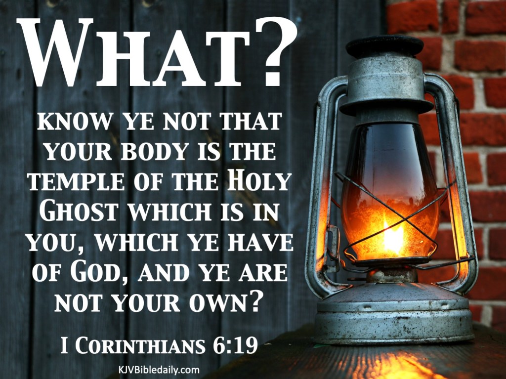 I Corinthians 6:19 KJV Share this:Tweet Share on WhatsApp (Opens in new window) WhatsApp Print (Opens in new window) Print Share on Reddit (Opens in new window) Reddit Email a link to a friend (Opens in new window) Email Share on Tumblr Share on Telegram (Opens in new window) Telegram Like Loading... Related