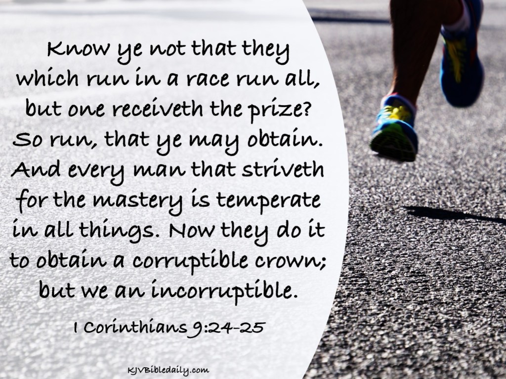 I Corinthians 9:24-25 KJV Share this:Tweet Share on WhatsApp (Opens in new window) WhatsApp Print (Opens in new window) Print Share on Reddit (Opens in new window) Reddit Email a link to a friend (Opens in new window) Email Share on TumblrPocket Share on Telegram (Opens in new window) Telegram Like Loading... Related