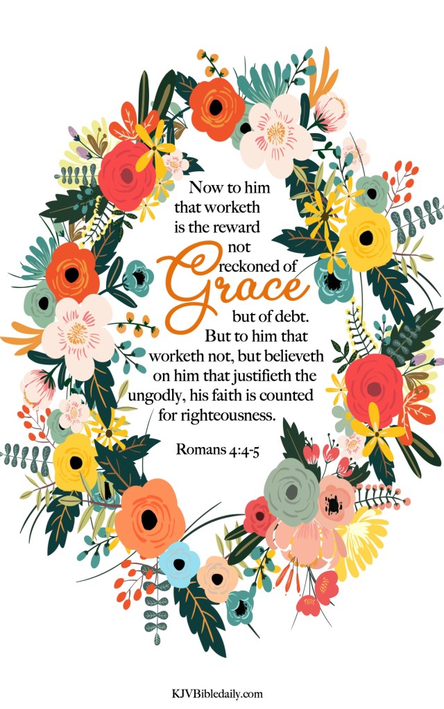 Romans 4:4-5 KJV Share this:Tweet Click to share on WhatsApp (Opens in new window) WhatsApp Click to print (Opens in new window) Print Click to share on Reddit (Opens in new window) Reddit Click to email a link to a friend (Opens in new window) Email Share on TumblrPocket Click to share on Telegram (Opens in new window) Telegram Like Loading... Related