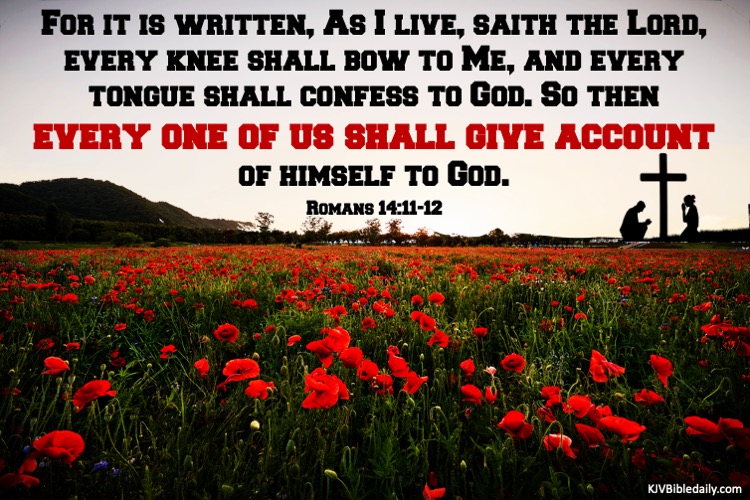Romans 14:11-12 KJV Share this:Tweet Share on WhatsApp (Opens in new window) WhatsApp Print (Opens in new window) Print Share on Reddit (Opens in new window) Reddit Email a link to a friend (Opens in new window) Email Share on TumblrPocket Share on Telegram (Opens in new window) Telegram Like Loading... Related