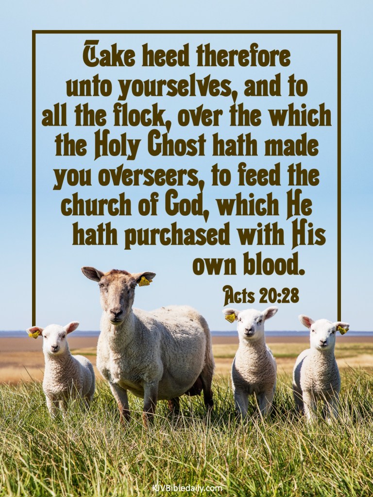 Acts 20:28 KJV Share this:Tweet Share on WhatsApp (Opens in new window) WhatsApp Print (Opens in new window) Print Share on Reddit (Opens in new window) Reddit Email a link to a friend (Opens in new window) Email Share on TumblrPocket Share on Telegram (Opens in new window) Telegram Like Loading... Related