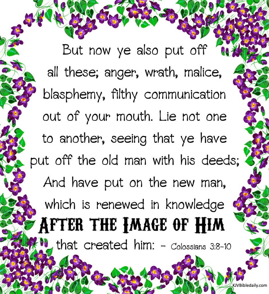 Colossians 3:8-10 KJV Share this:Tweet Share on WhatsApp (Opens in new window) WhatsApp Print (Opens in new window) Print Share on Reddit (Opens in new window) Reddit Email a link to a friend (Opens in new window) Email Share on TumblrPocket Share on Telegram (Opens in new window) Telegram Like Loading... Related