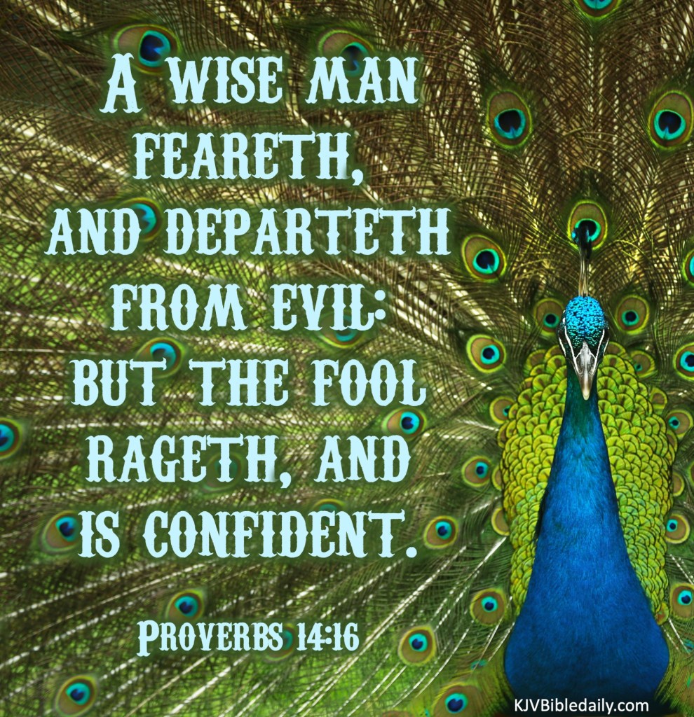 Proverbs 14:16 KJV Share this:Tweet Share on WhatsApp (Opens in new window) WhatsApp Print (Opens in new window) Print Share on Reddit (Opens in new window) Reddit Email a link to a friend (Opens in new window) Email Share on Tumblr Share on Telegram (Opens in new window) Telegram Like Loading... Related