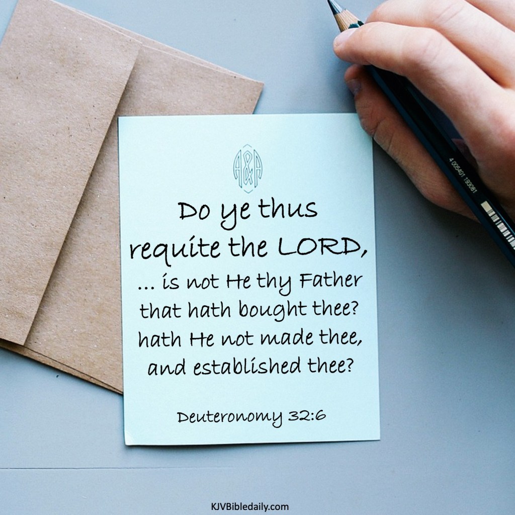 Deuteronomy 32:6 KJV Share this:Tweet Share on WhatsApp (Opens in new window) WhatsApp Print (Opens in new window) Print Share on Reddit (Opens in new window) Reddit Email a link to a friend (Opens in new window) Email Share on Tumblr Share on Telegram (Opens in new window) Telegram Like Loading... Related