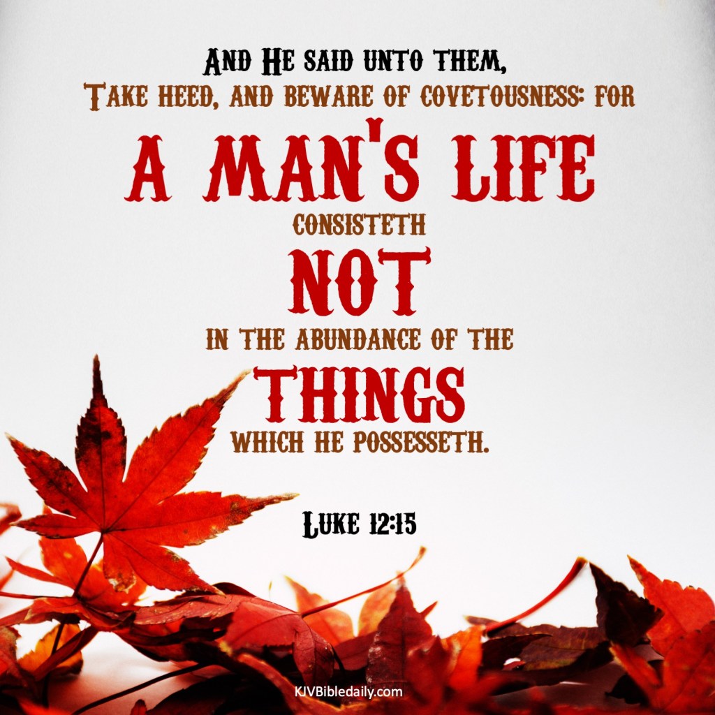 Luke 12:15 KJV Share this:Tweet Share on WhatsApp (Opens in new window) WhatsApp Print (Opens in new window) Print Share on Reddit (Opens in new window) Reddit Email a link to a friend (Opens in new window) Email Share on Tumblr Share on Telegram (Opens in new window) Telegram Like Loading... Related