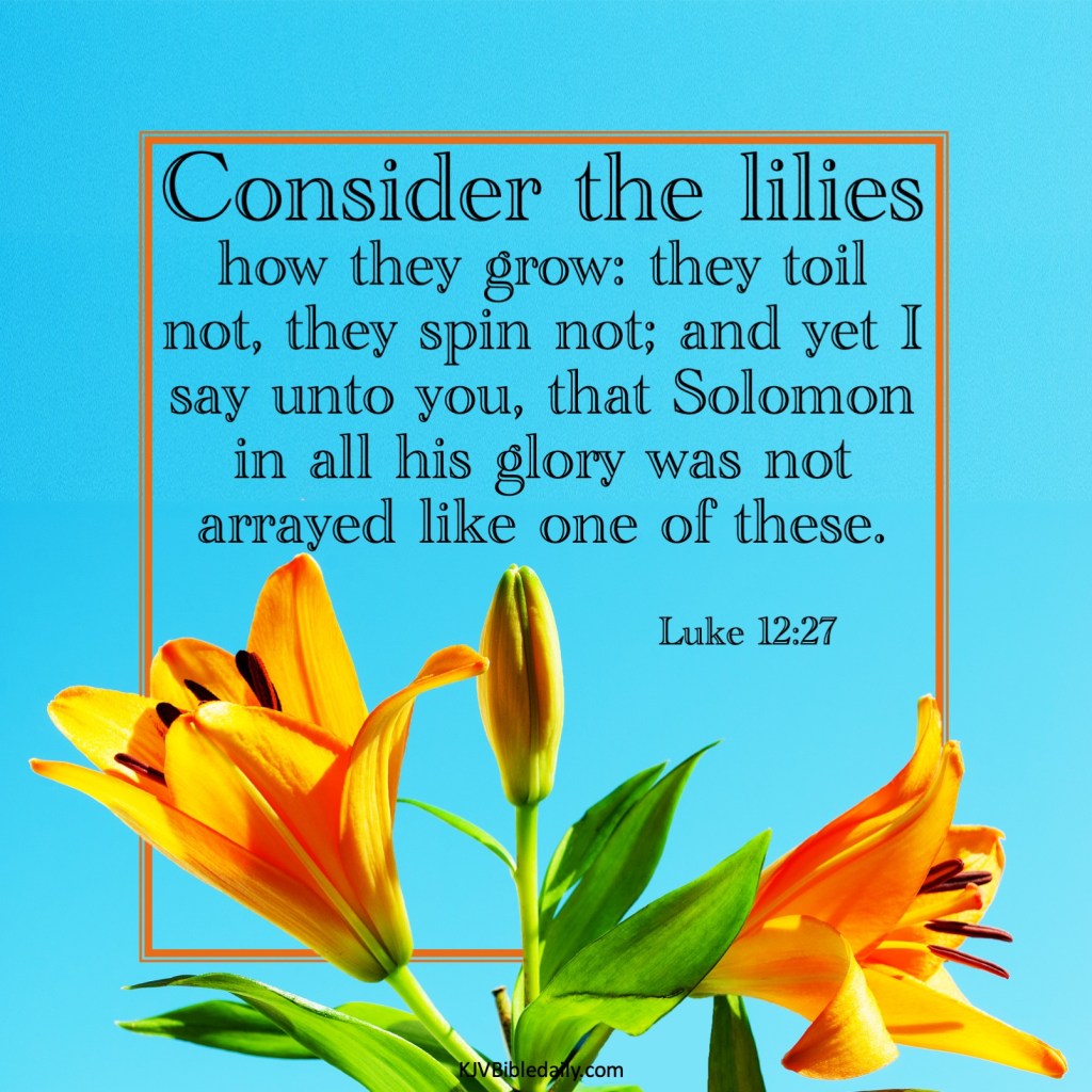 Luke 12:27 KJV Share this:Tweet Share on WhatsApp (Opens in new window) WhatsApp Print (Opens in new window) Print Share on Reddit (Opens in new window) Reddit Email a link to a friend (Opens in new window) Email Share on Tumblr Share on Telegram (Opens in new window) Telegram Like Loading... Related