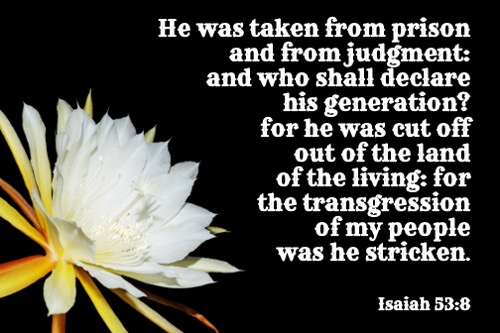 Isaiah 53:8 KJV Share this:Tweet Share on WhatsApp (Opens in new window) WhatsApp Print (Opens in new window) Print Share on Reddit (Opens in new window) Reddit Email a link to a friend (Opens in new window) Email Share on TumblrPocket Share on Telegram (Opens in new window) Telegram Like Loading... Related