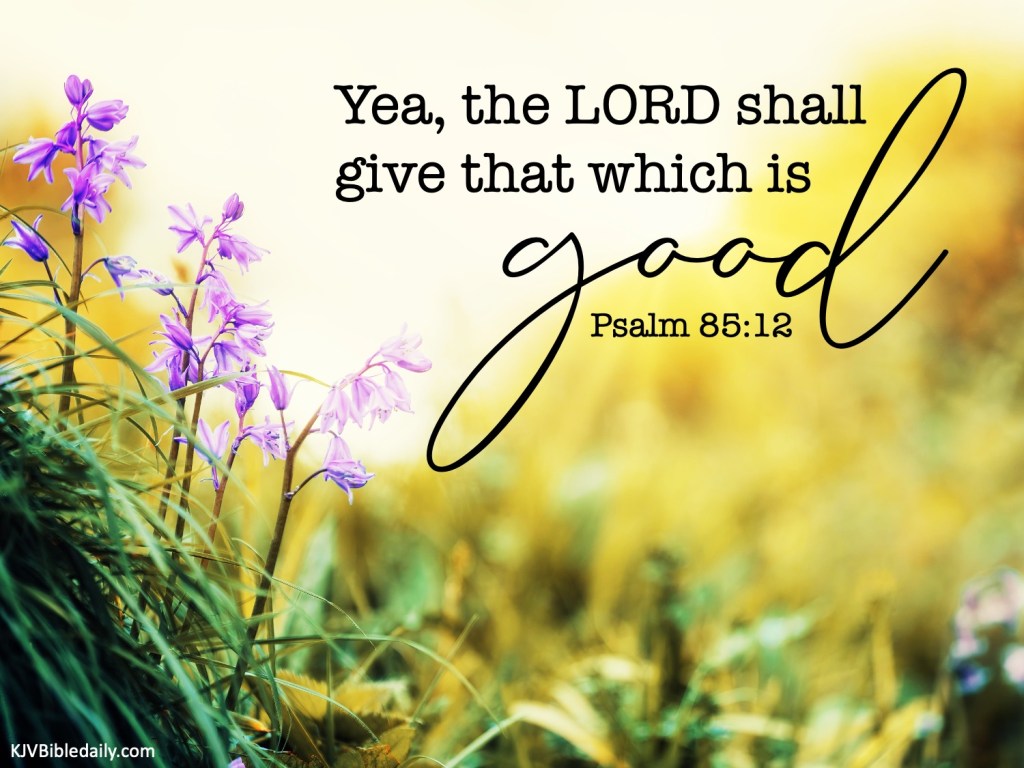 Psalm 85:12 KJV Share this:Tweet Share on WhatsApp (Opens in new window) WhatsApp Print (Opens in new window) Print Share on Reddit (Opens in new window) Reddit Email a link to a friend (Opens in new window) Email Share on TumblrPocket Share on Telegram (Opens in new window) Telegram Like Loading... Related