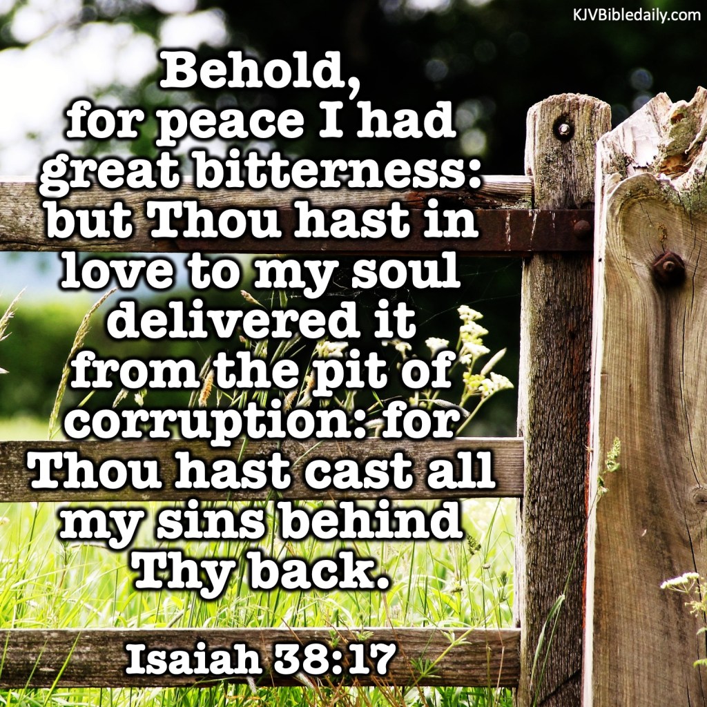 Isaiah 38:17 KJV Share this:Tweet Share on WhatsApp (Opens in new window) WhatsApp Print (Opens in new window) Print Share on Reddit (Opens in new window) Reddit Email a link to a friend (Opens in new window) Email Share on TumblrPocket Share on Telegram (Opens in new window) Telegram Like Loading... Related