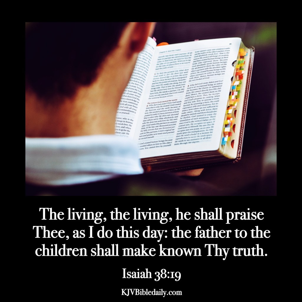 Isaiah 38:19 KJV Share this:Tweet Share on WhatsApp (Opens in new window) WhatsApp Print (Opens in new window) Print Share on Reddit (Opens in new window) Reddit Email a link to a friend (Opens in new window) Email Share on TumblrPocket Share on Telegram (Opens in new window) Telegram Like Loading... Related