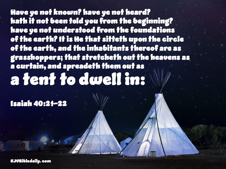 Isaiah 40:21-22 KJV Share this:Tweet Share on WhatsApp (Opens in new window) WhatsApp Print (Opens in new window) Print Share on Reddit (Opens in new window) Reddit Email a link to a friend (Opens in new window) Email Share on TumblrPocket Share on Telegram (Opens in new window) Telegram Like Loading... Related