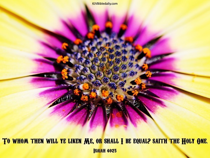 Isaiah 40:25 KJV Share this:Tweet Share on WhatsApp (Opens in new window) WhatsApp Print (Opens in new window) Print Share on Reddit (Opens in new window) Reddit Email a link to a friend (Opens in new window) Email Share on TumblrPocket Share on Telegram (Opens in new window) Telegram Like Loading... Related