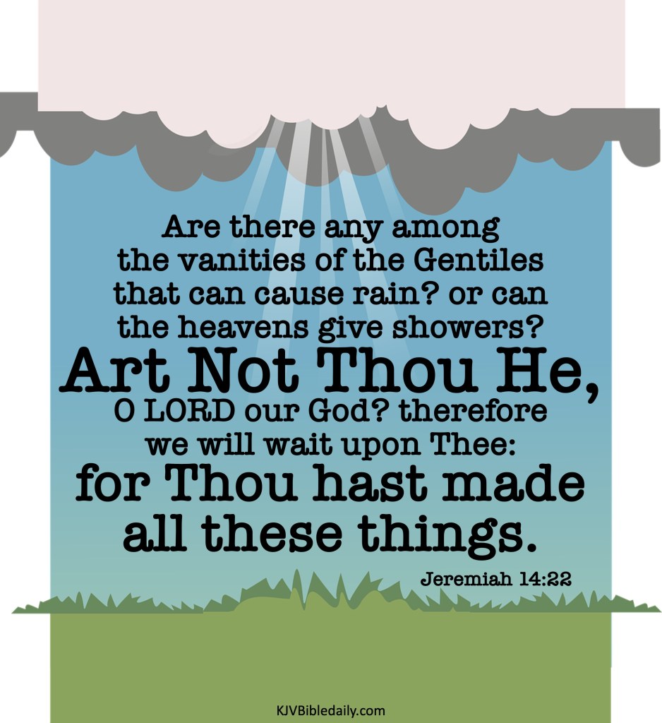 Jeremiah 14:22 KJV Share this:Tweet Share on WhatsApp (Opens in new window) WhatsApp Print (Opens in new window) Print Share on Reddit (Opens in new window) Reddit Email a link to a friend (Opens in new window) Email Share on Tumblr Share on Telegram (Opens in new window) Telegram Like Loading... Related