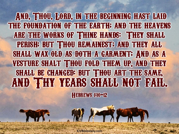 Hebrews 1:10-12 KJV Share this:Tweet Share on WhatsApp (Opens in new window) WhatsApp Print (Opens in new window) Print Share on Reddit (Opens in new window) Reddit Email a link to a friend (Opens in new window) Email Share on TumblrPocket Share on Telegram (Opens in new window) Telegram Like Loading... Related