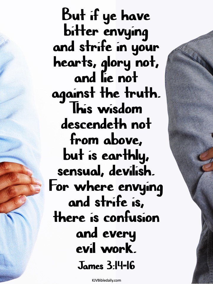 James 3:14-16 KJV Share this:Tweet Share on WhatsApp (Opens in new window) WhatsApp Print (Opens in new window) Print Share on Reddit (Opens in new window) Reddit Email a link to a friend (Opens in new window) Email Share on Tumblr Share on Telegram (Opens in new window) Telegram Like Loading... Related