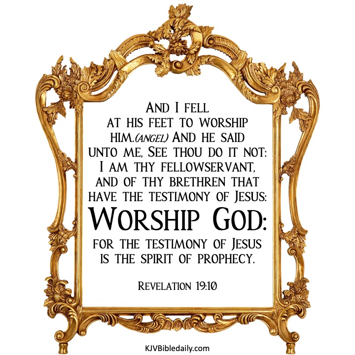 Revelation 19:10 KJV Share this:Tweet Share on WhatsApp (Opens in new window) WhatsApp Print (Opens in new window) Print Share on Reddit (Opens in new window) Reddit Email a link to a friend (Opens in new window) Email Share on Tumblr Share on Telegram (Opens in new window) Telegram Like Loading... Related