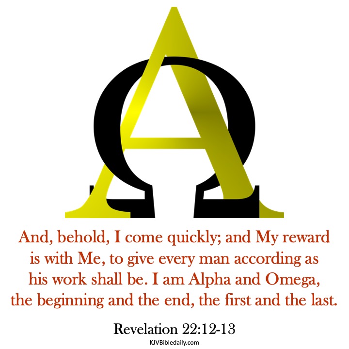 Revelation 22:12-13 KJV Share this:Tweet Share on WhatsApp (Opens in new window) WhatsApp Print (Opens in new window) Print Share on Reddit (Opens in new window) Reddit Email a link to a friend (Opens in new window) Email Share on Tumblr Share on Telegram (Opens in new window) Telegram Like Loading... Related