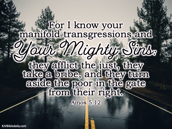 Amos 5:12 KJV Share this:Tweet Share on WhatsApp (Opens in new window) WhatsApp Print (Opens in new window) Print Share on Reddit (Opens in new window) Reddit Email a link to a friend (Opens in new window) Email Share on Tumblr Share on Telegram (Opens in new window) Telegram Like Loading... Related