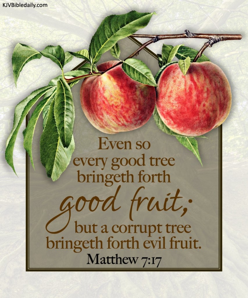 Matthew 7:17 KJV Share this:Tweet Share on WhatsApp (Opens in new window) WhatsApp Print (Opens in new window) Print Share on Reddit (Opens in new window) Reddit Email a link to a friend (Opens in new window) Email Share on Tumblr Share on Telegram (Opens in new window) Telegram Like Loading... Related