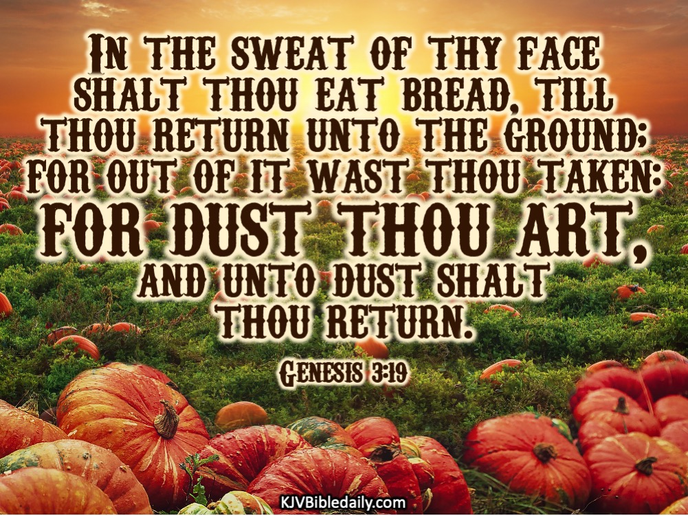 Genesis 3:19 KJV Share this:Tweet Click to share on WhatsApp (Opens in new window) WhatsApp Click to print (Opens in new window) Print Click to share on Reddit (Opens in new window) Reddit Click to email a link to a friend (Opens in new window) Email Share on TumblrPocket Click to share on Telegram (Opens in new window) Telegram Like Loading... Related