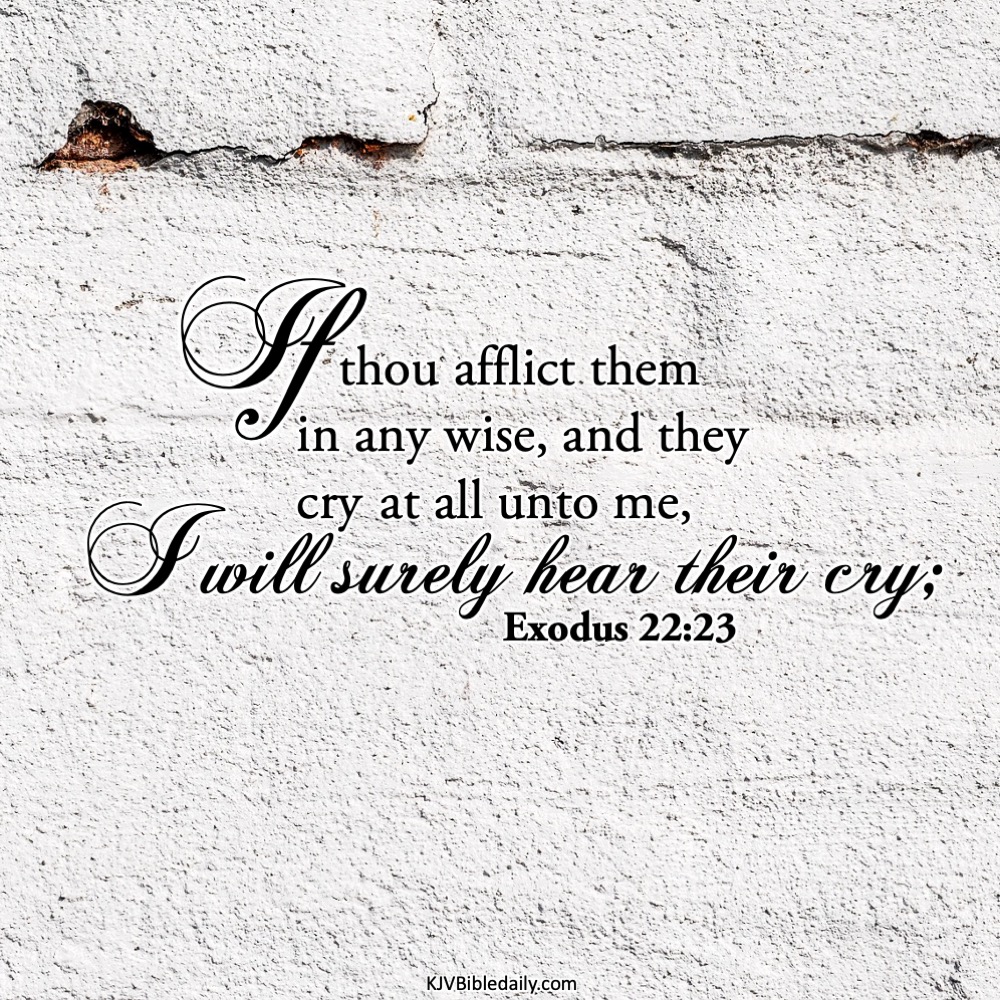 Exodus 22:23 KJV Share this:Tweet Click to share on WhatsApp (Opens in new window) WhatsApp Click to print (Opens in new window) Print Click to share on Reddit (Opens in new window) Reddit Click to email a link to a friend (Opens in new window) Email Share on TumblrPocket Click to share on Telegram (Opens in new window) Telegram Like Loading... Related