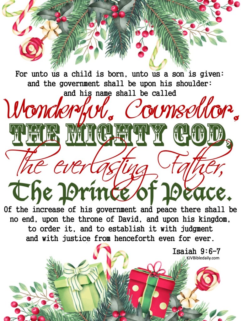 Isaiah 9:6-7 KJV Share this:Tweet Share on WhatsApp (Opens in new window) WhatsApp Print (Opens in new window) Print Share on Reddit (Opens in new window) Reddit Email a link to a friend (Opens in new window) Email Share on Tumblr Share on Telegram (Opens in new window) Telegram Like Loading... Related