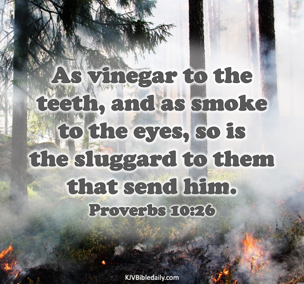 Proverbs 10:26 KJV Share this:Tweet Share on WhatsApp (Opens in new window) WhatsApp Print (Opens in new window) Print Share on Reddit (Opens in new window) Reddit Email a link to a friend (Opens in new window) Email Share on Tumblr Share on Telegram (Opens in new window) Telegram Like Loading... Related