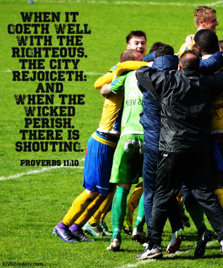 Proverbs 11:10 KJV Share this:Tweet Share on WhatsApp (Opens in new window) WhatsApp Print (Opens in new window) Print Share on Reddit (Opens in new window) Reddit Email a link to a friend (Opens in new window) Email Share on Tumblr Share on Telegram (Opens in new window) Telegram Like Loading... Related