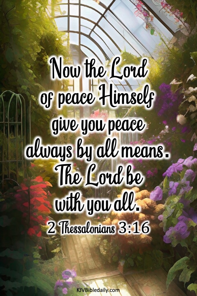 2 Thessalonians 3:16 KJV Share this:Tweet Share on WhatsApp (Opens in new window) WhatsApp Print (Opens in new window) Print Share on Reddit (Opens in new window) Reddit Email a link to a friend (Opens in new window) Email Share on Tumblr Share on Telegram (Opens in new window) Telegram Like Loading... Related