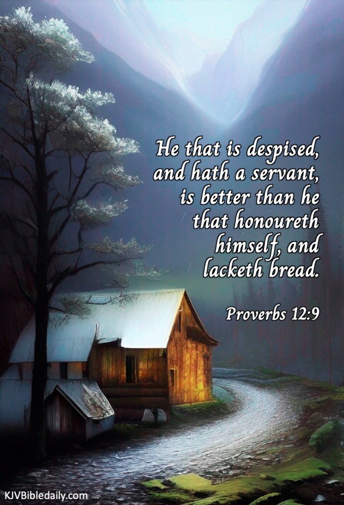 Proverbs 12:9 KJV Share this:Tweet Share on WhatsApp (Opens in new window) WhatsApp Print (Opens in new window) Print Share on Reddit (Opens in new window) Reddit Email a link to a friend (Opens in new window) Email Share on Tumblr Share on Telegram (Opens in new window) Telegram Like Loading... Related