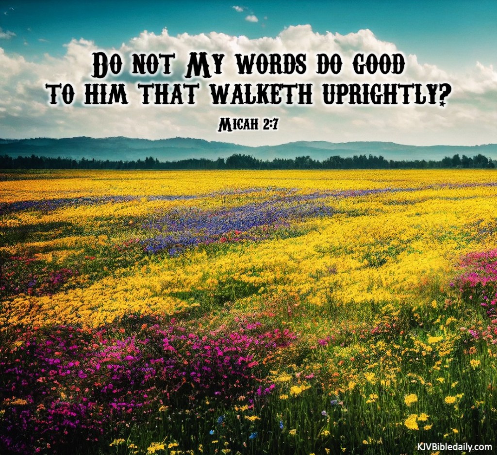 Micah 2:7 KJV Share this:Tweet Share on WhatsApp (Opens in new window) WhatsApp Print (Opens in new window) Print Share on Reddit (Opens in new window) Reddit Email a link to a friend (Opens in new window) Email Share on Tumblr Share on Telegram (Opens in new window) Telegram Like Loading... Related