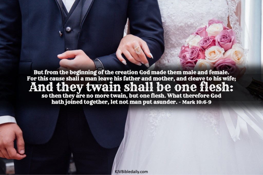 Mark 10:6-9 KJV Share this:Tweet Share on WhatsApp (Opens in new window) WhatsApp Print (Opens in new window) Print Share on Reddit (Opens in new window) Reddit Email a link to a friend (Opens in new window) Email Share on Tumblr Share on Telegram (Opens in new window) Telegram Like Loading... Related