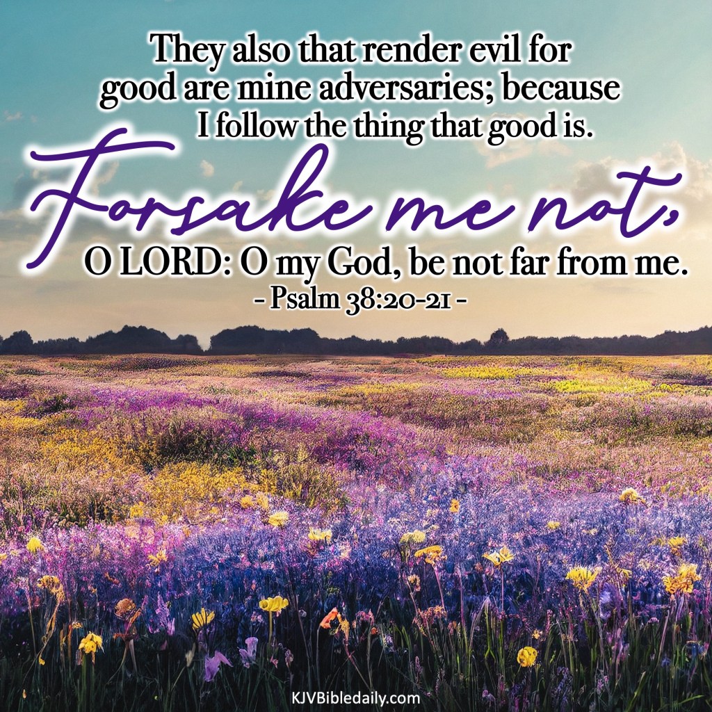 Psalm 38:20-21 KJV Share this:Tweet Share on WhatsApp (Opens in new window) WhatsApp Print (Opens in new window) Print Share on Reddit (Opens in new window) Reddit Email a link to a friend (Opens in new window) Email Share on Tumblr Share on Telegram (Opens in new window) Telegram Like Loading... Related