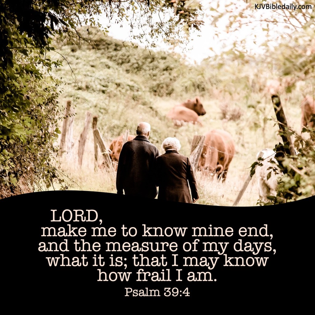 Psalm 39:4 KJV Share this:Tweet Share on WhatsApp (Opens in new window) WhatsApp Print (Opens in new window) Print Share on Reddit (Opens in new window) Reddit Email a link to a friend (Opens in new window) Email Share on Tumblr Share on Telegram (Opens in new window) Telegram Like Loading... Related