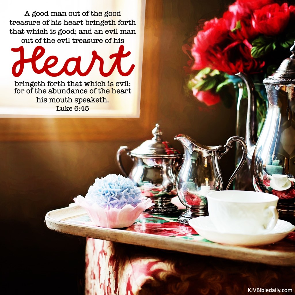 Luke 6:45 KJV Share this:Tweet Share on WhatsApp (Opens in new window) WhatsApp Print (Opens in new window) Print Share on Reddit (Opens in new window) Reddit Email a link to a friend (Opens in new window) Email Share on Tumblr Share on Telegram (Opens in new window) Telegram Like Loading... Related