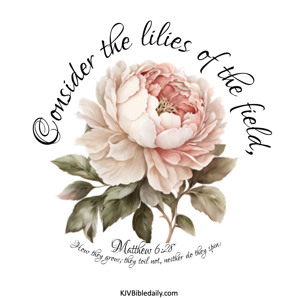 Matthew 6:28 KJV Shop for products with this design here… Share this:Tweet Share on WhatsApp (Opens in new window) WhatsApp Print (Opens in new window) Print Share on Reddit (Opens in new window) Reddit Email a link to a friend (Opens in new window) Email Share on TumblrPocket Share on Telegram (Opens in new window) Telegram Like Loading... Related
