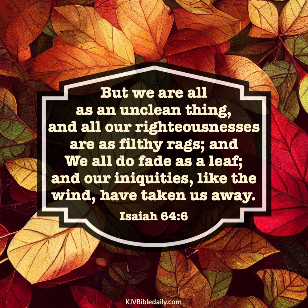 Isaiah 64:6 KJV Share this:Tweet Share on WhatsApp (Opens in new window) WhatsApp Print (Opens in new window) Print Share on Reddit (Opens in new window) Reddit Email a link to a friend (Opens in new window) Email Share on TumblrPocket Share on Telegram (Opens in new window) Telegram Like Loading... Related