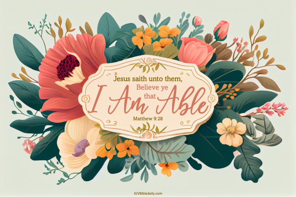 Matthew 9:28 KJV Share this:Tweet Share on WhatsApp (Opens in new window) WhatsApp Print (Opens in new window) Print Share on Reddit (Opens in new window) Reddit Email a link to a friend (Opens in new window) Email Share on TumblrPocket Share on Telegram (Opens in new window) Telegram Like Loading... Related