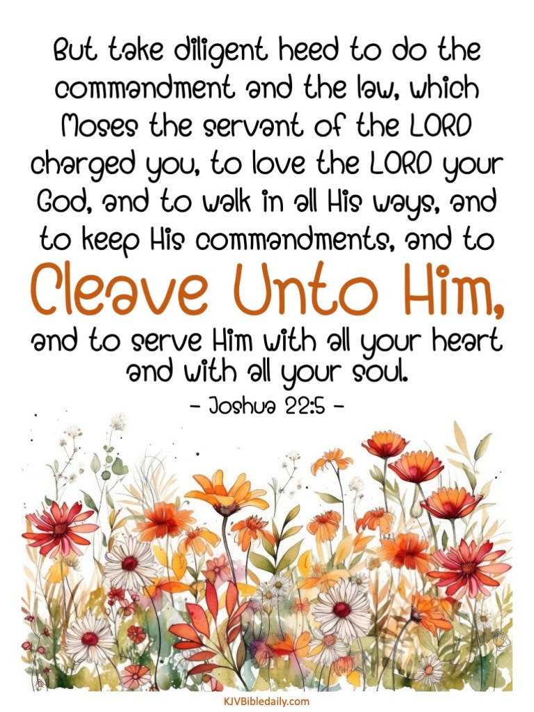 Joshua 22:5 KJV Share this:Tweet Click to share on WhatsApp (Opens in new window) WhatsApp Click to print (Opens in new window) Print Click to share on Reddit (Opens in new window) Reddit Click to email a link to a friend (Opens in new window) Email Share on TumblrPocket Click to share on Telegram (Opens in new window) Telegram Like Loading... Related