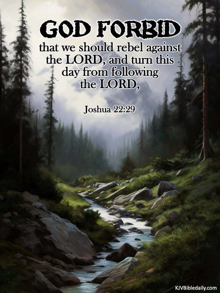 Joshua 22:29 KJV Share this:Tweet Share on WhatsApp (Opens in new window) WhatsApp Print (Opens in new window) Print Share on Reddit (Opens in new window) Reddit Email a link to a friend (Opens in new window) Email Share on TumblrPocket Share on Telegram (Opens in new window) Telegram Like Loading... Related