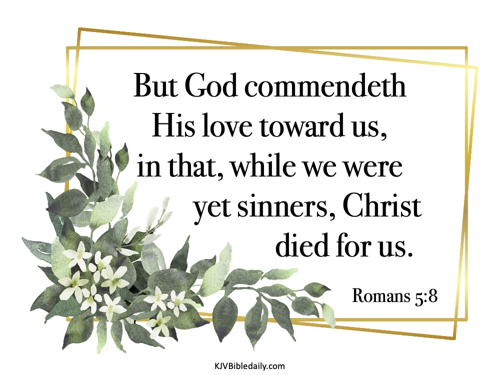 Romans 5:8 KJV Share this:Tweet Share on WhatsApp (Opens in new window) WhatsApp Print (Opens in new window) Print Share on Reddit (Opens in new window) Reddit Email a link to a friend (Opens in new window) Email Share on Tumblr Share on Telegram (Opens in new window) Telegram Like Loading... Related