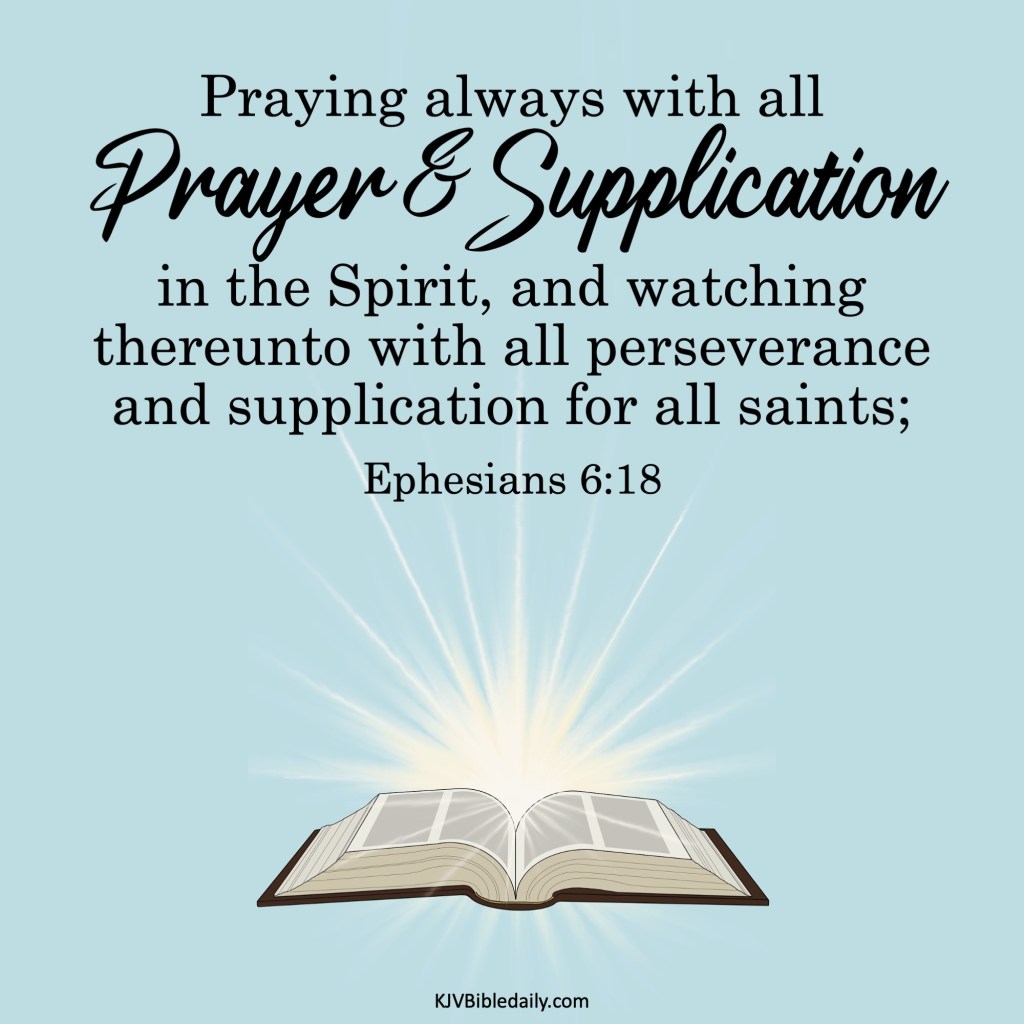 Ephesians 6:18 KJV Share this:Tweet Click to share on WhatsApp (Opens in new window) WhatsApp Click to print (Opens in new window) Print Click to share on Reddit (Opens in new window) Reddit Click to email a link to a friend (Opens in new window) Email Share on TumblrPocket Click to share on Telegram (Opens in new window) Telegram Like Loading... Related