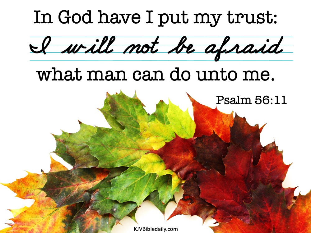 Psalm 56:11 KJV Share this:Tweet Click to share on WhatsApp (Opens in new window) WhatsApp Click to print (Opens in new window) Print Click to share on Reddit (Opens in new window) Reddit Click to email a link to a friend (Opens in new window) Email Share on TumblrPocket Click to share on Telegram (Opens in new window) Telegram Like Loading... Related