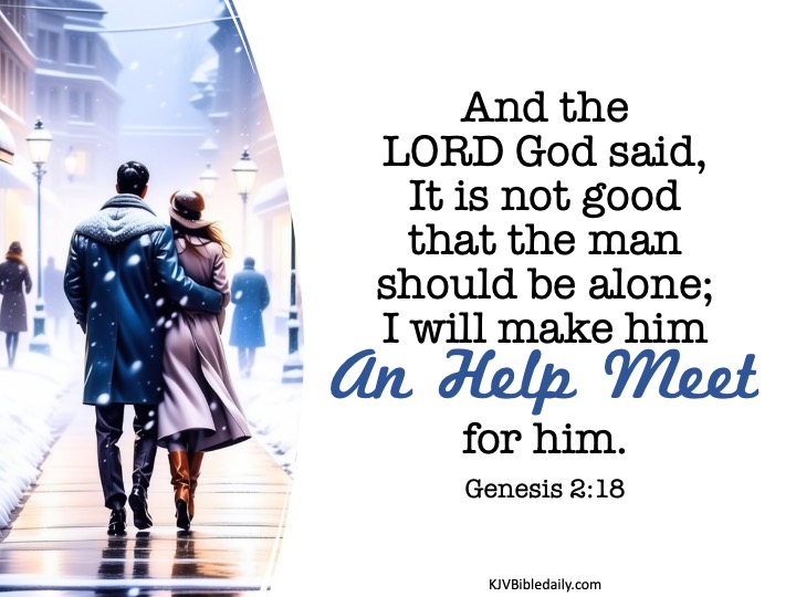 Genesis 2:18 KJV Share this:Tweet Click to share on WhatsApp (Opens in new window) WhatsApp Click to print (Opens in new window) Print Click to share on Reddit (Opens in new window) Reddit Click to email a link to a friend (Opens in new window) Email Share on TumblrPocket Click to share on Telegram (Opens in new window) Telegram Like Loading... Related