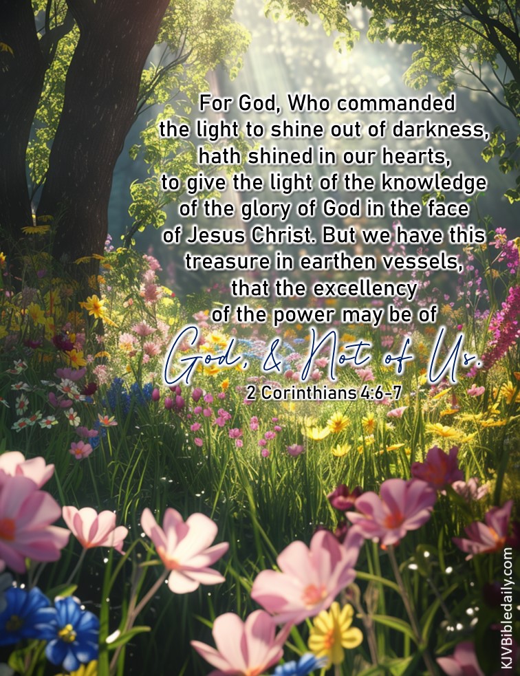 2 Corinthians 4:6-7 KJV Share this:Tweet Click to share on WhatsApp (Opens in new window) WhatsApp Click to print (Opens in new window) Print Click to share on Reddit (Opens in new window) Reddit Click to email a link to a friend (Opens in new window) Email Share on TumblrPocket Click to share on Telegram (Opens in new window) Telegram Like Loading... Related