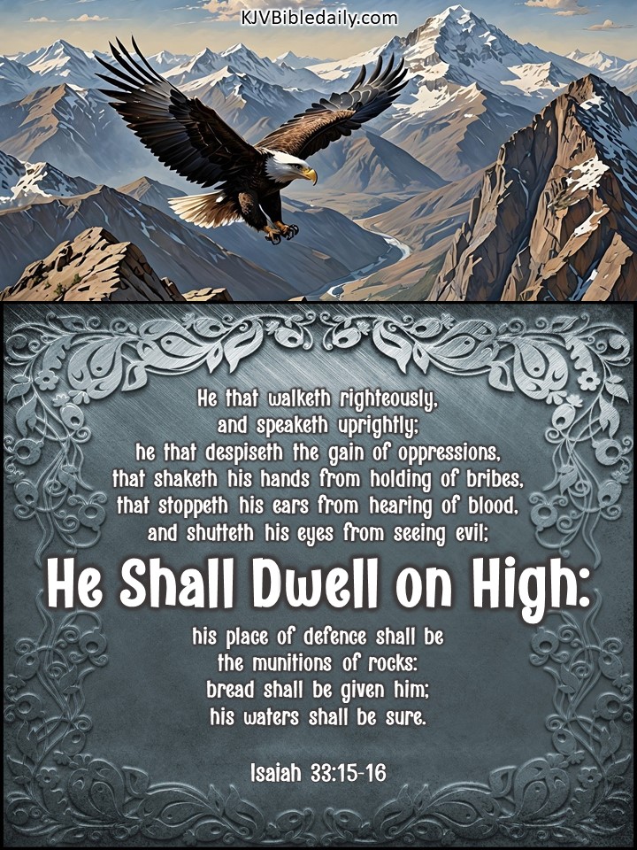 Isaiah 33:15-16 KJV <a href=" Share this:Tweet Click to share on WhatsApp (Opens in new window) WhatsApp Click to print (Opens in new window) Print Click to share on Reddit (Opens in new window) Reddit Click to email a link to a friend (Opens in new window) Email Share on TumblrPocket Click to share on Telegram (Opens in new window) Telegram Like Loading... Related