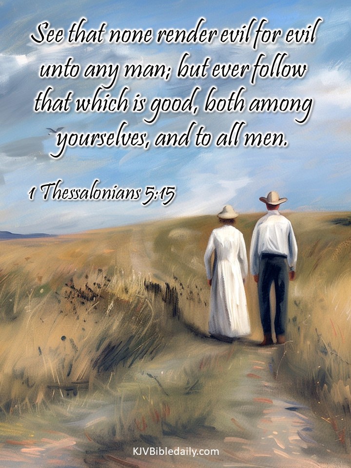 1 Thessalonians 5:15 KJV <a href=" Share this:Tweet Click to share on WhatsApp (Opens in new window) WhatsApp Click to print (Opens in new window) Print Click to share on Reddit (Opens in new window) Reddit Click to email a link to a friend (Opens in new window) Email Share on TumblrPocket Click to share on Telegram (Opens in new window) Telegram Like Loading... Related